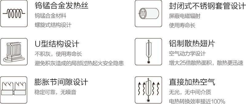 核心發(fā)熱元件采用 U 型的安全結(jié)構(gòu)設(shè)計(jì),不積灰,無(wú)炭化的可能。